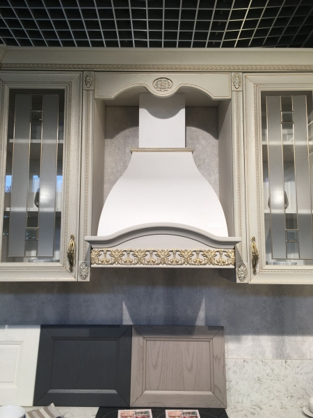 На главном фото представлена вытяжка в цвете купола белый муар, деревянное обрамление из бука покраска RAL1013 патина золото.