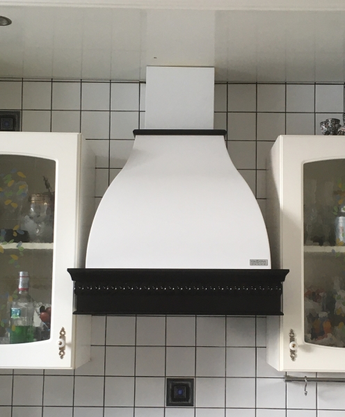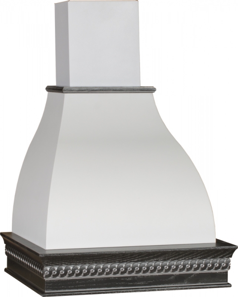 На фото представлена вытяжка в цвете купола белый муар, деревянное обрамление из дуба в цвете Гальяно.
