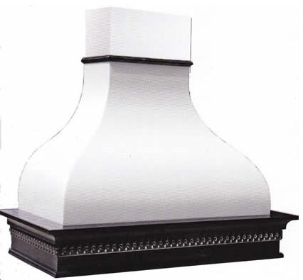 На фото представлена вытяжка в цвете купола белый муар, деревянное обрамление из дуба, в цвете Гальяно