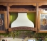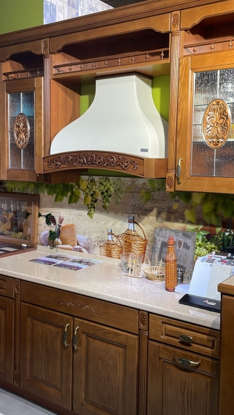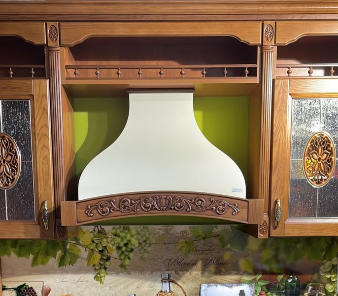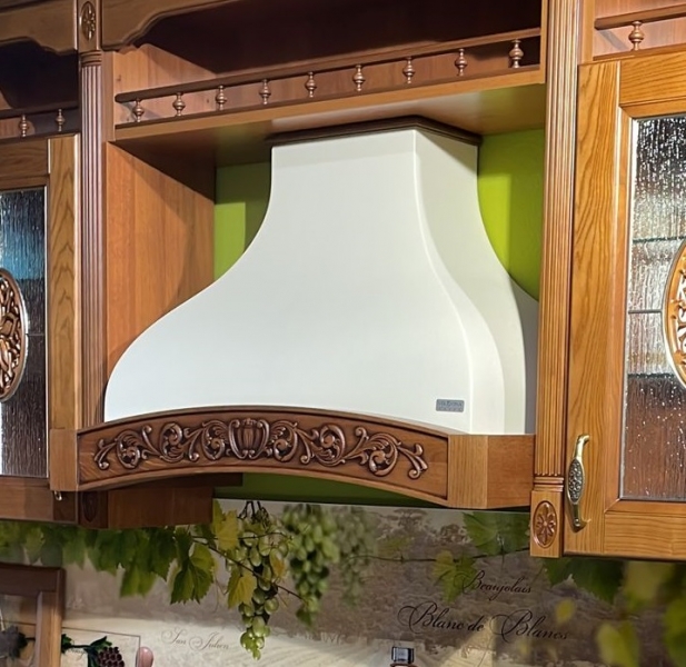 На фото представлена вытяжка в цвете купола белый муар, деревянное обрамление из бука цвет орех