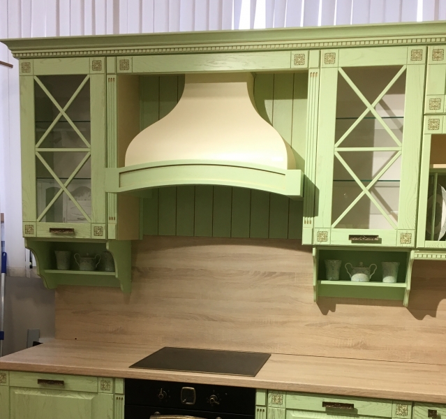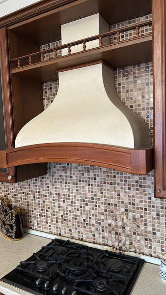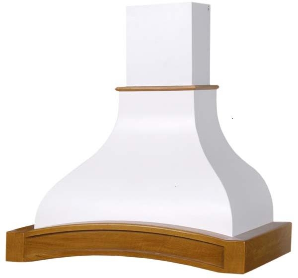 На фото представлена вытяжка в цвете купола белый муар, деревянное обрамление из Бука цвет Арена.