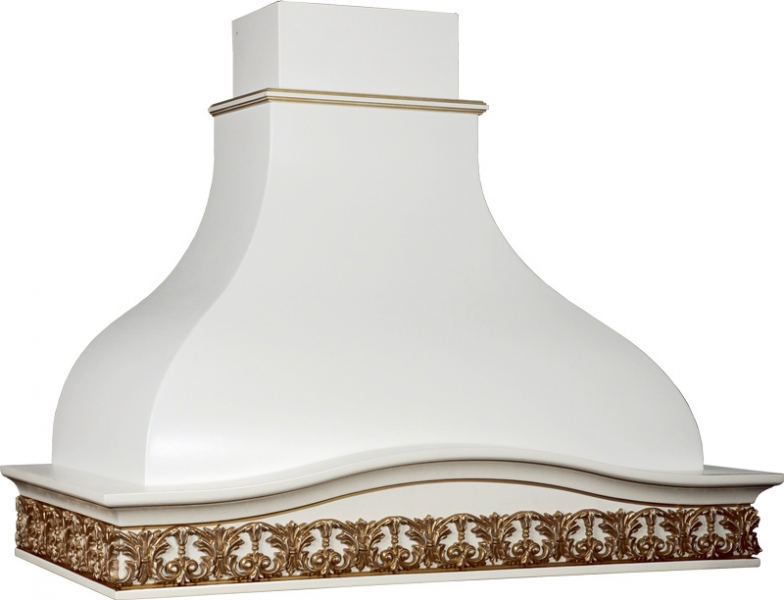 На центральном фото представлена вытяжка в цвете купола белый муар, деревянное обрамление в цвете Инфинти голд.