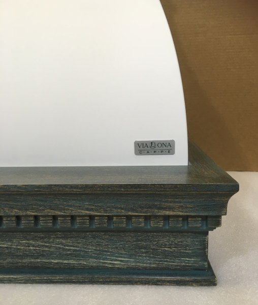 На фото представлена вытяжка в цвете купола белый муар, деревянное обрамление из бука цвет белый.