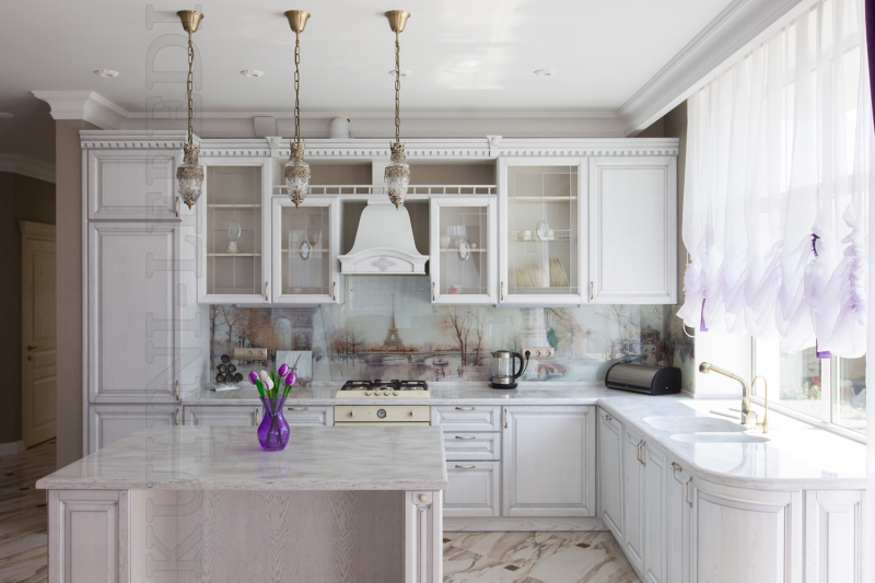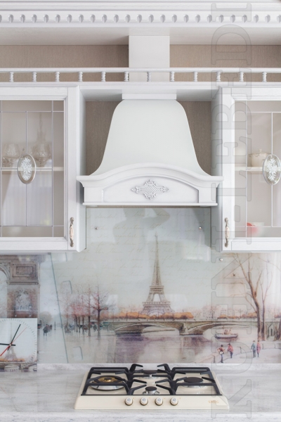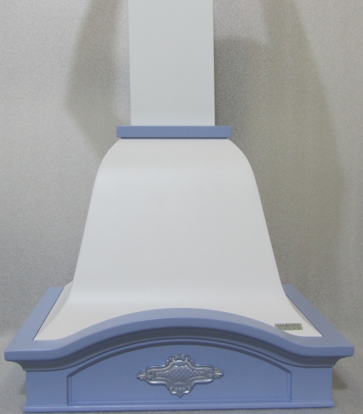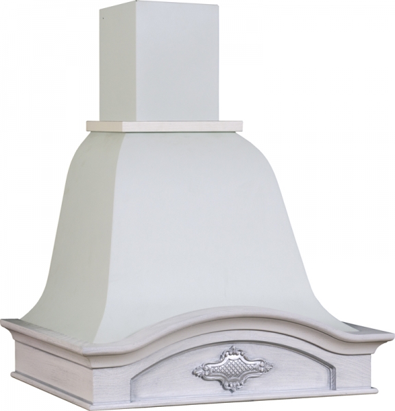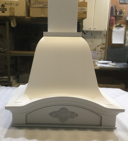 На фото представлена вытяжка в цвете купола белый муар, деревянное обрамление из дуба цвет Руджери.
