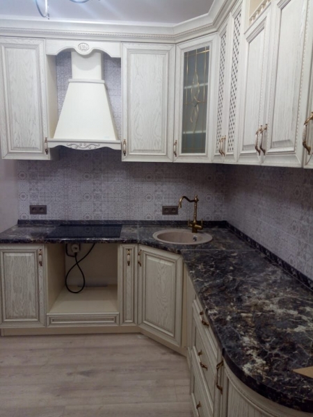 На центральном фото представлена вытяжка в цвете купола белый муар, деревянное обрамление из бука