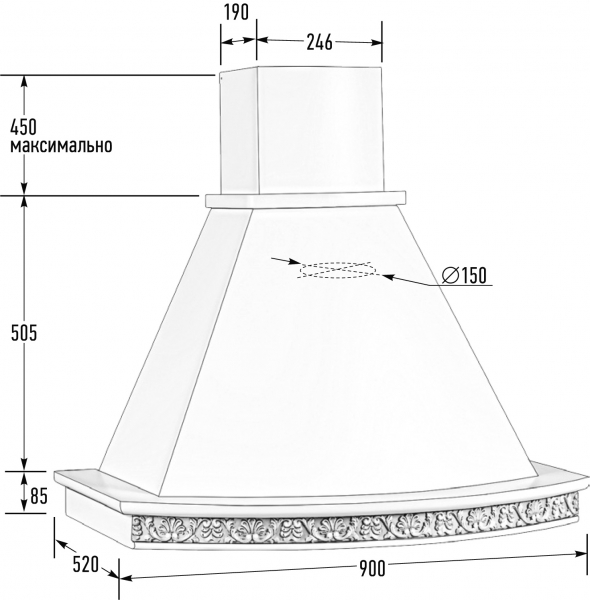 Купол вытяжки выполнен из металла толщиной 7 мм, окрашен порошковой краской.