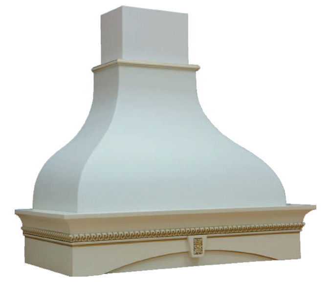На фото представлена вытяжка в цвете купола белый муар, деревянное обрамление из бука цвет Нике Авори патина золото.