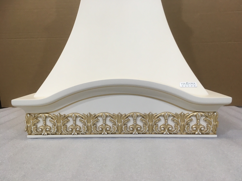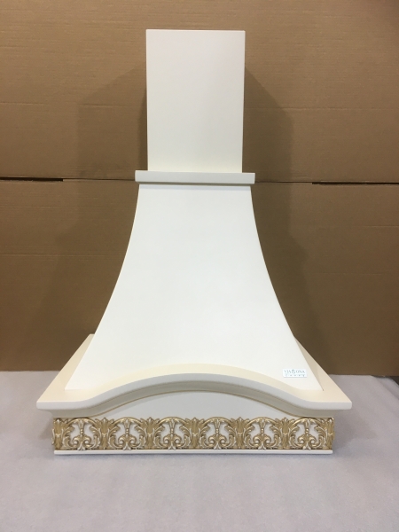 На главном фото представлена вытяжка в цвете купола белый муар, деревянное обрамление из бука покраска RAL9001 патина золото.