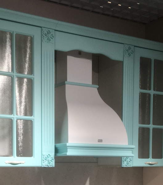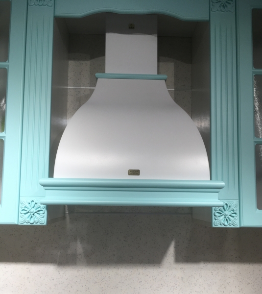 На фото представлена вытяжка в цвете купола белый муар, деревянное обрамление из Бука RAL 6027.