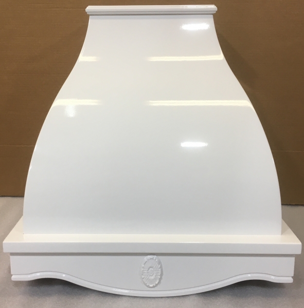 На фото представлена вытяжка в цвете купола белый муар, деревянное обрамление из бука цвет RAL 1013 патина золото